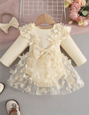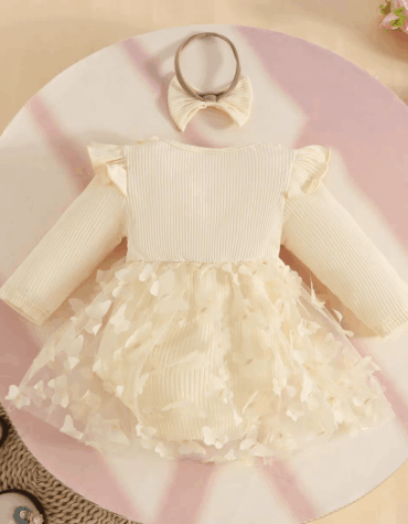 فستان بناتي لطيف بأكمام طويلة مزين بالفراشات مع ربطة شعر