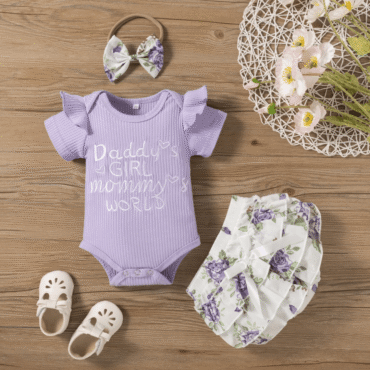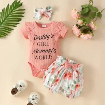 طقم بناتي صيفي مكون من 3 قطع بودي سوت و شورت مع ربطة راس بتصميم جذاب