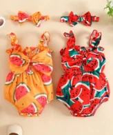 بوديسوت مثلث مزين بفيونكة بدون أكمام مع ربطة شعر صيفي للبنات الرضع