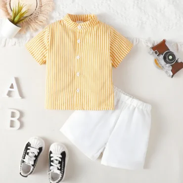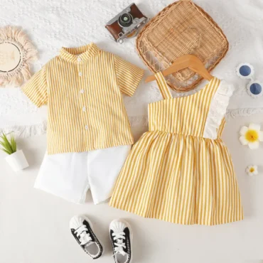 طقم الاخوة مكون من قميص بأكمام قصيرة مخطط مع شورت & فستان مخطط