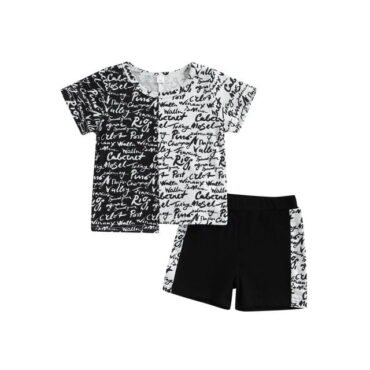 طقم ولادي فخم مكون من قطعتين تي شيرت بأكمام قصيرة وشورت نمط منقوش حروف للاطفال الصغار