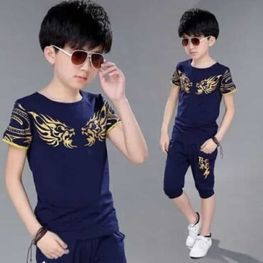 طقم ولادي انيق مكون من قطعتين تي شيرت بأكمام قصيرة وشورت للاطفال الصغار