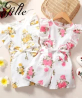 فستان بأكمام قصيرة على الطراز الكوري مزينة بنقشة الزهور للأطفال حديثي الولادة