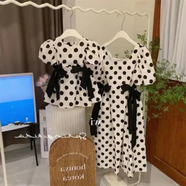 فستان راقي مزين بفيونكات مصصم على الطراز الكوري للام وابنتها، نمط منقط