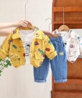 طقم فاخر وراقي يتكون من 3 قطع، جاكيت بأكمام طويلة وفنيلا وبنطلون جينز