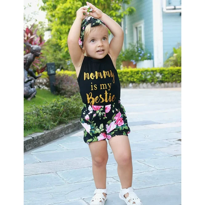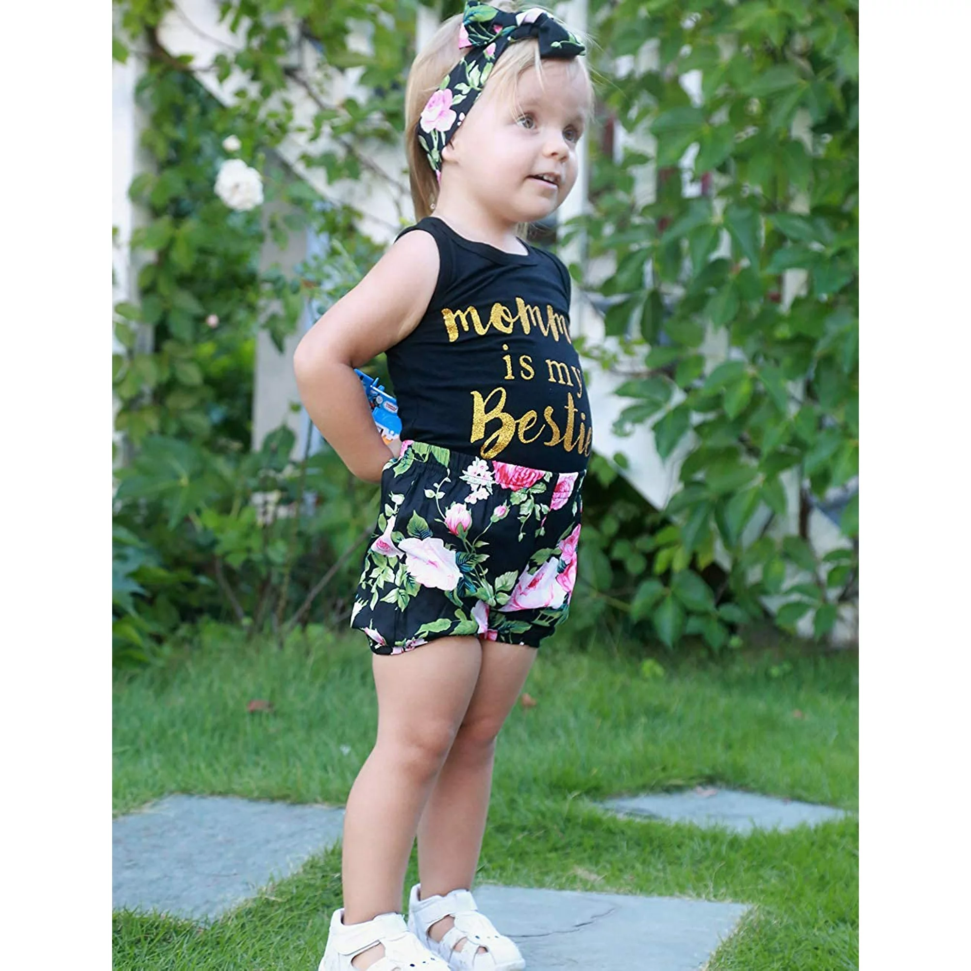 طقم مواليد بناتي من 3 قطع تي شيرت بدون أكمام نمط حروف شورت منقوش زهري وربطة رأس