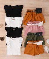 طقم بناتي انيق 2 قطع بلوزة بأكمام قصيرة وشورت