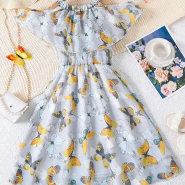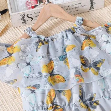 فستان بناتي بطباعة فراشة وأكتاف مكشوفة مكشكشة