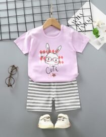 طقم بناتي 2 قطع بلوزة بأكمام قصيرة وشورت، نمط بطة