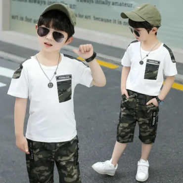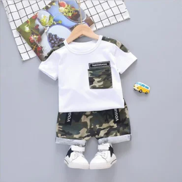 طقم ولادي حديث 2 قطع تي شيرت & شورت نمط عسكري