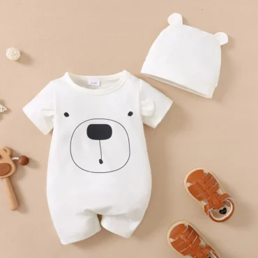 رومبير قطني انيق بأكمام قصيرة مع قبعة نمط الدب، للأطفال حديثي الولادة