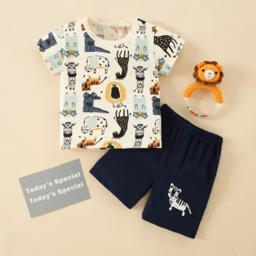 طقم ولادي فخم 2 قطع تي شيرت برقبة مستديرة & شورت نمط الحيوان