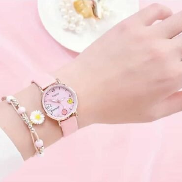 ساعة يد انيقة مع سوار من الجلد ، لون وردي للبنات