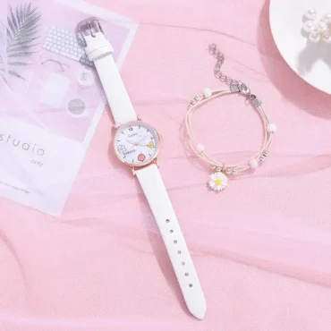 ساعة يد انيقة مع سوار من الجلد ، لون اسود للنساء والأطفال مع الكرتون