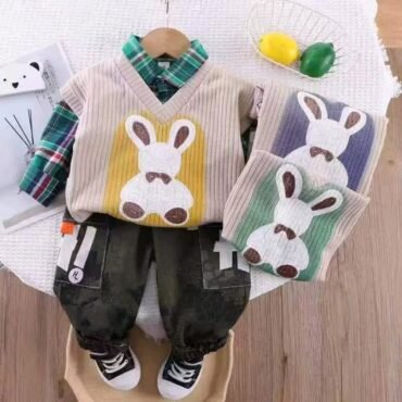 طقم ولادي بتصميم حديث مكون من 3قطع بلوفر وشميز مزين بجيب وسروال بألوان متناسقة